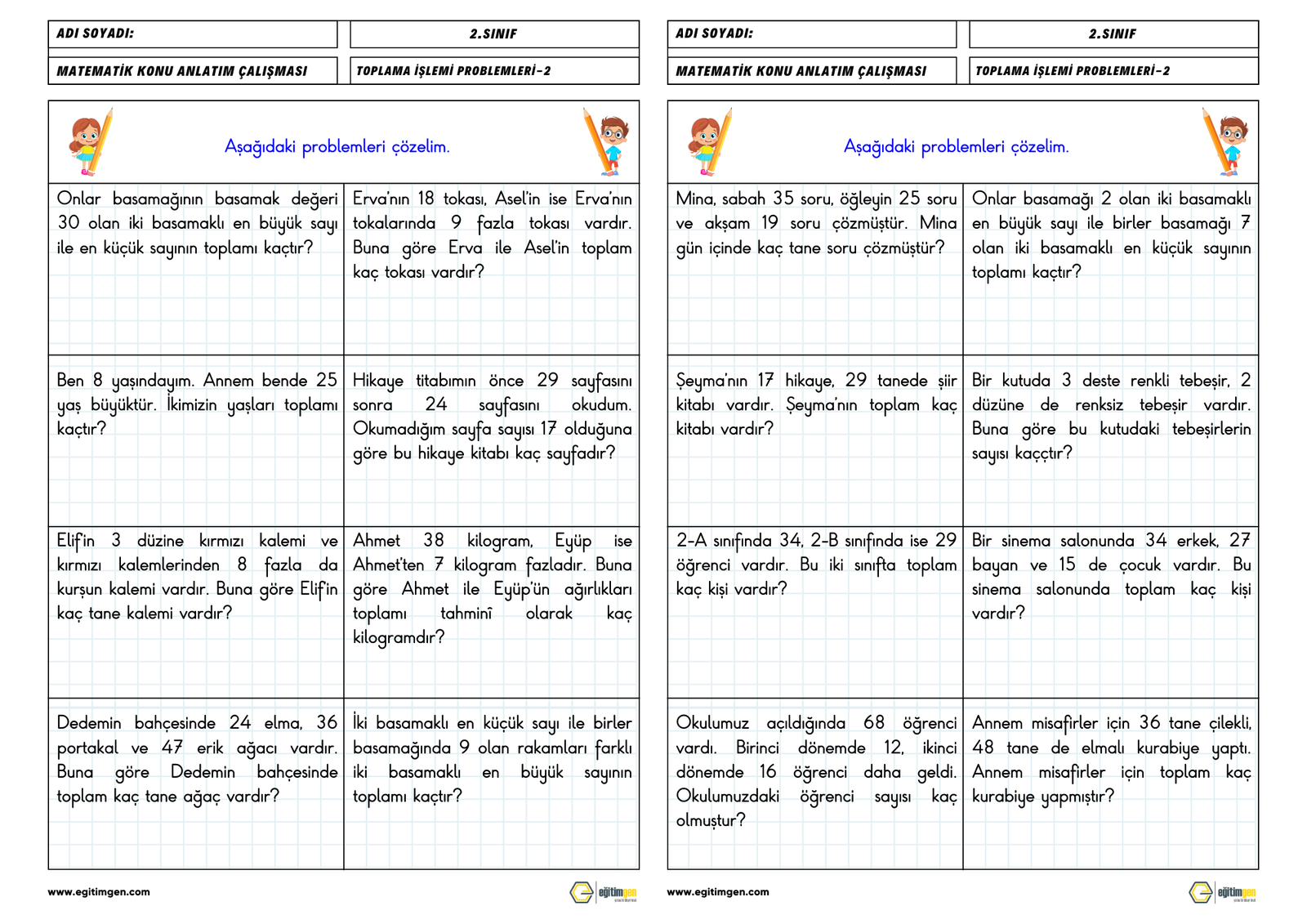 Mat2-21 Toplama İşlemi İle İlgili Problemler